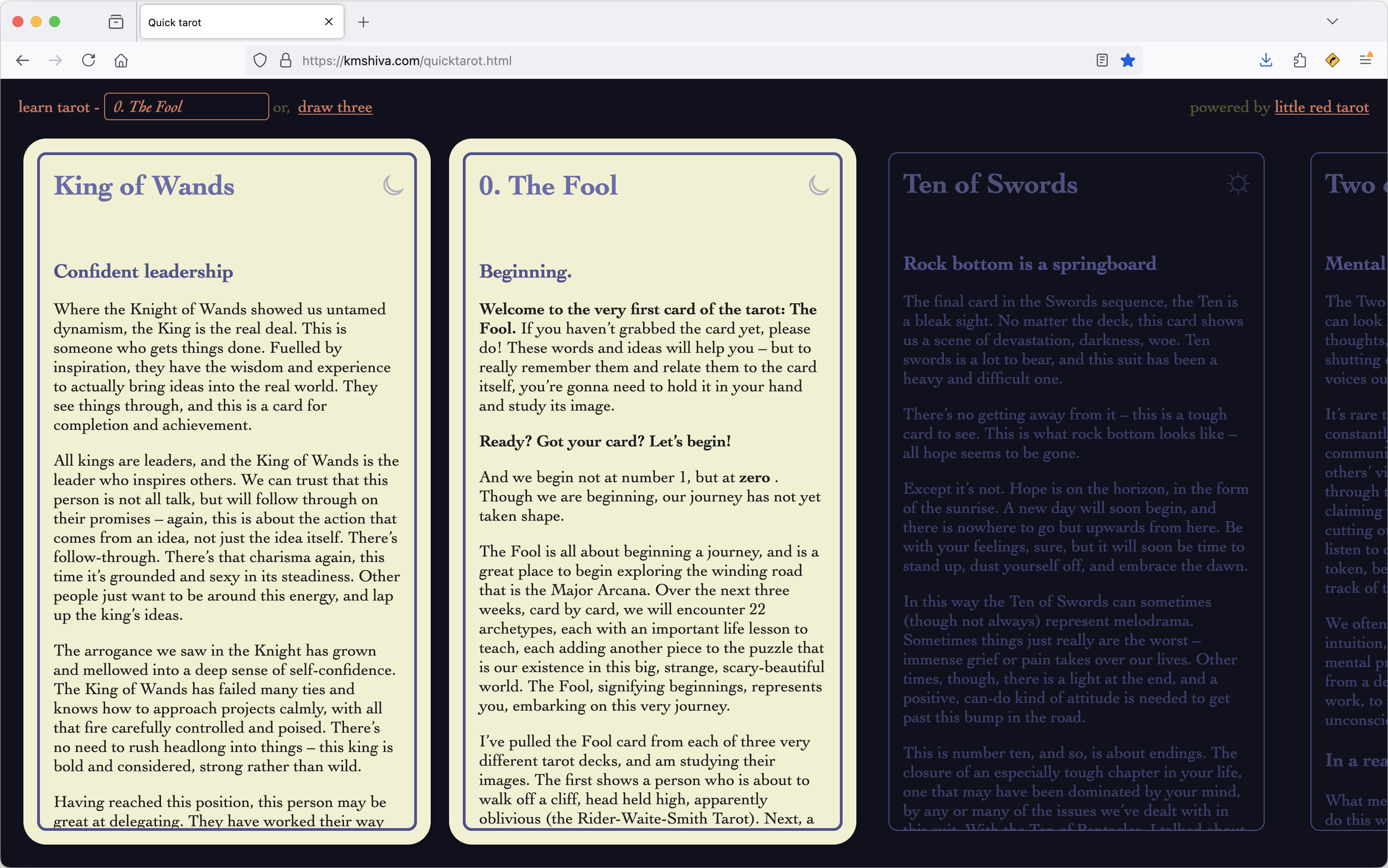 A core need for this tool was to help me build a ritual of reading the tarot. This needs simplicity, to keep my focus on my reflection. Web apps for all their accessibility advantages can also be frustrating because they foist change onto users, forcing them out of their rituals and practices. Keeping this as a HTML file that can be saved offline, allows the user to trust it to be stable.
